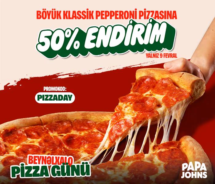 "Beynəlxalq Pizza Günü" münasibətilə Böyük Klassik Pepperoni pizzasını 50% endirimlə sifariş etmək üçün mobil tətbiqimizi yüklə!