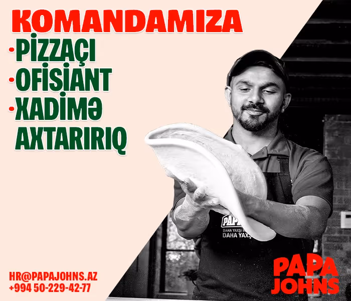 Papa John’s Azərbaycan, tanınmış Amerika brendi olan, “Daha yaxşı inqrediyentlər daha yaxşı pizza” şüarı ilə addımlayan, pizza restoranlar şəbəkəsi Pizzaçı, Növbə meneceri, Ofisiant və Xadimə vakansiyasını elan edir: